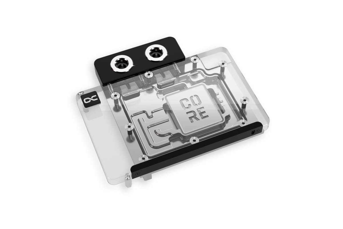 Die optische Gestaltung des GPU-Wasserkühlers wurde nur geringfügig verändert. Ein besonderes Highlight ist das neu hinzugekommene Core-Emblem über der Jetplate, dass die Zugehörigkeit zur Core-Serie unterstreicht und das Design visuell aufwertet. Die Serie setzt weiterhin auf hochwertige Messinganschlüsse, die optimale Qualität und Sicherheit garantieren. Die speziell angepasste Aluminium-Backplate bedeckt die komplette Rückseite des Kupferkühlers und sorgt für eine klare und einheitliche Optik. Das Acryl, in Kombination mit der aRGB-Beleuchtung, ermöglicht eine gleichmäßige und beeindruckende Beleuchtung des gesamten Kühlers.