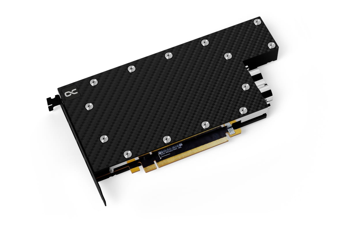 Der Alphacool ES Copper/Carbon Wasserkühler mit Backplate wurde speziell für die Alphacool Enterprise Series entwickelt. Aufgrund der Positionierung der Anschlüsse wird die Verschlauchung des Kühlers im Serverrack wesentlich vereinfacht. Die Kühleroberseite wird aus Carbon gefertigt. Das macht den Wasserkühler leichter im Vergleich zu Alphacool's Eisblöcken mit Acetal- oder Acryltop. Dank der kompakten Bauweise wird für die Montage des Kühlers im Serverrack nur 1 Slot benötigt anstatt wie bisher 1,5 Slots. Diese zusätzliche Platzersparnis ist ein Argument mehr, für die Verwendung des ES Copper/Carbon Grafikkarten Wasserkühlers.