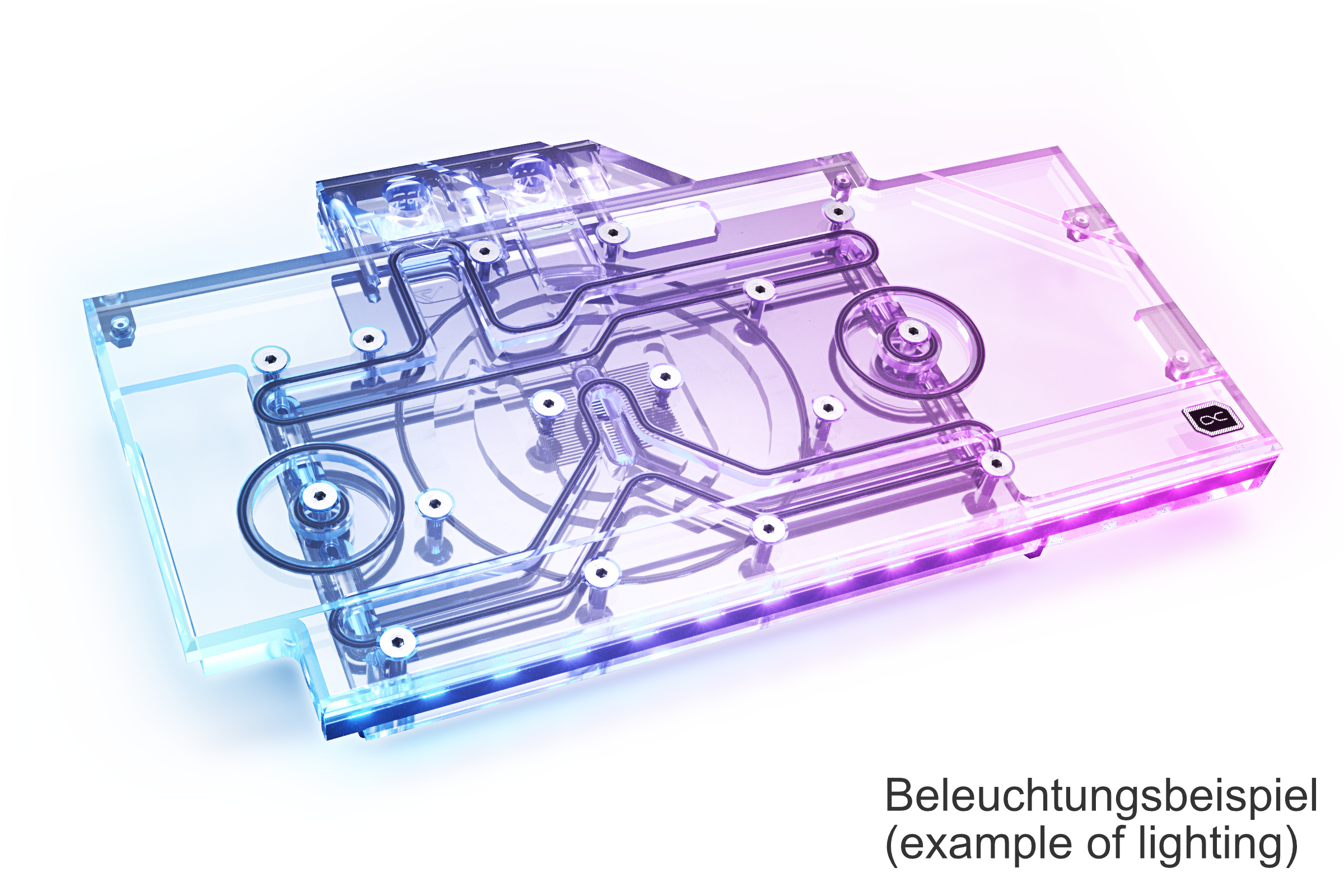 Der Eisblock Aurora GPX-N RTX 3080/3090 Kühler wurde grundlegend so aufgebaut, dass die Beleuchtung mehr im Vordergrund steht als bei den bisherigen Modellen. Die adressierbaren digitalen RGB LEDs sind direkt in den Kühlblock eingelassen und sie verlaufen seitlich an dem ganzen Kühlblock entlang. Der Effekt ist eine Beleuchtung, die den gesamten Kühlblock einschließt. Keine Ecke oder Kante bleibt durch die aRGB LEDs unbeleuchtet. Das neue Design ist kantiger, wobei alle Kanten abgeschrägt sind. Die Folge ist eine bessere Lichtstreuung im Wasserkühler durch die Reflektionen an diesen Schrägen. Außerdem erzeugen sie diverse Konturen, die dem Eisblock Aurora GPX-N RTX 3080/3090 Kühler eine ganz eigene optische Note geben.