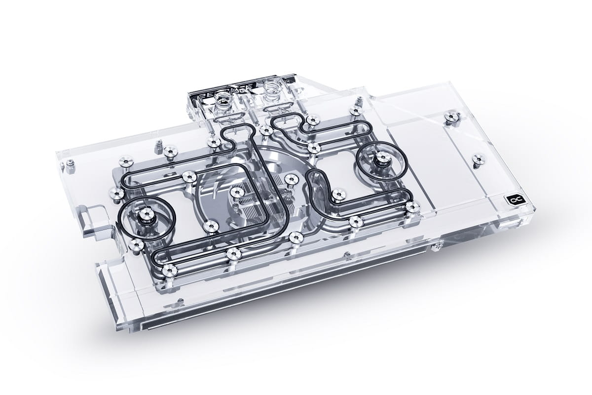 Bei der Entwicklung des Eisblock Aurora Acryl GPX-N RTX 3070 ROG Strix Grafikkarten-Wasserkühlers wurde natürlich auch Wert auf eine Leistungssteigerung gelegt. Im ersten Schritt wurde der Kühler näher an die einzelnen Bauteile gebracht, indem man die Wärmeleitpads auf eine Dicke von 1 mm reduziert hat. Im zweiten Schritt wurde der vernickelte Kupferblock ebenfalls dünner gestaltet. Statt bisher 7 mm ist er nur noch 5,5 mm dick. Der Wasserfluss wurde innerhalb des Kühlers ebenfalls optimiert. Alle wichtigen Bauteile wie die Spannungswandler und der RAM werden nun deutlich besser und effektiver vom Wasser gekühlt. Das alles sorgt für eine signifikante Steigerung der Kühlleistung.
