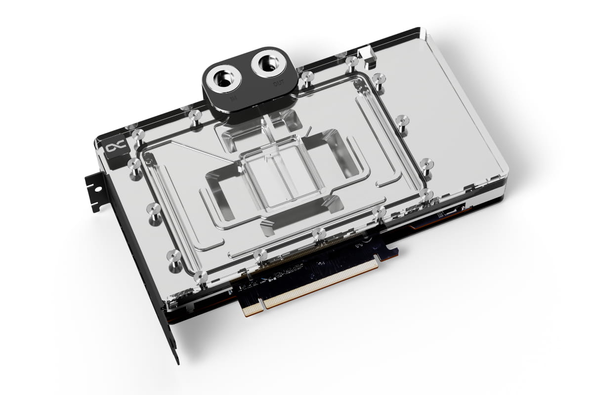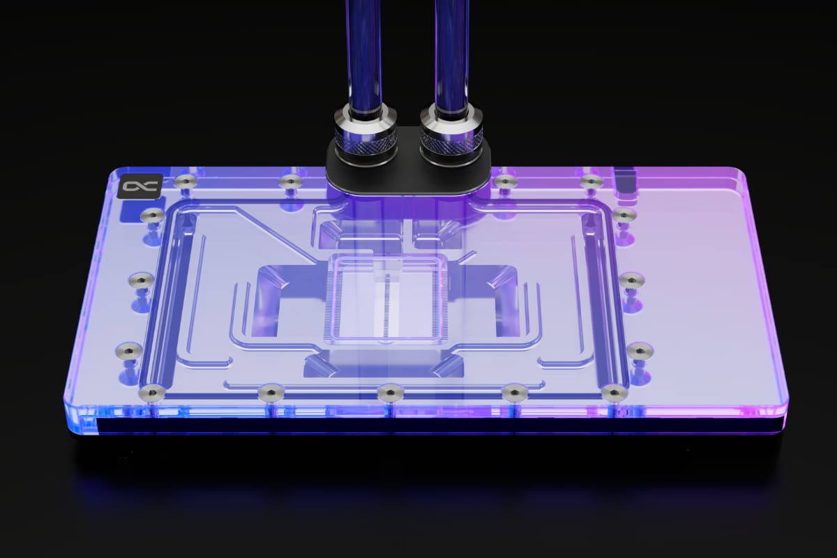 Die technische Weiterentwicklung zeigt sich beim Wasserzulauf zur Düsenplatte sowie bei der Optimierung der Jetplate selbst. Diese wurde komplett neu gestaltet auf Basis von vielen Simulationen und praktischen Tests in Zusammenarbeit mit Boardpartnern. Die Finnendicke und Abstände wurden verändert, die Kühlfläche vergrößert und der Wasserfluss auf die Kernkomponenten mit der größten Wärmeabgabe optimiert. Die beiliegenden speziellen Soft Wärmeleitpads mit bis zu 7 W/mK passen sich perfekt selbst kleinsten Toleranzen an.