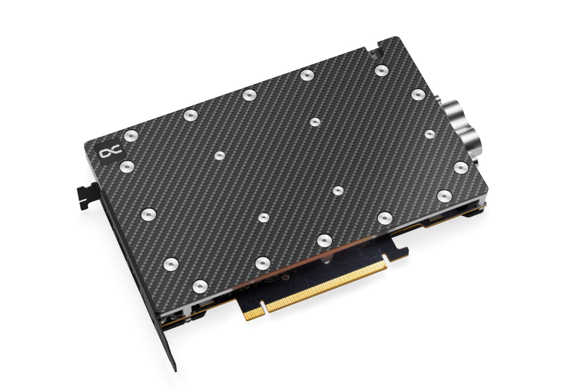 Um in der Breite und Höhe Platz beim Einbau zu sparen, wurden Ein- und Ausgang hinten am Kühlblock verlegt. Diese Positionierung der Anschlüsse erleichtert die Verschlauchung erheblich und ermöglicht so die einfache Einbindung des GPU Kühlers in den Wasserkreislauf auch in den engsten Server Gehäusen.