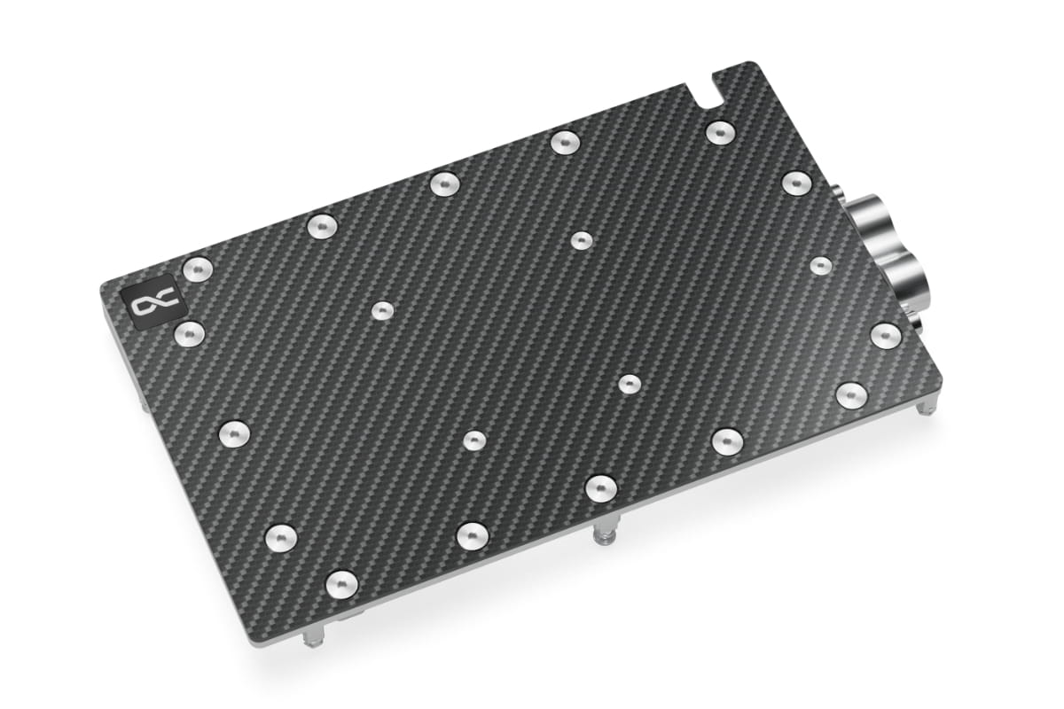 Der Alphacool ES Copper/Carbon Wasserkühler mit Backplate wurde speziell für die Alphacool Enterprise Series entwickelt. Aufgrund der Positionierung der Anschlüsse wird die Verschlauchung des Kühlers im Serverrack wesentlich vereinfacht. Die Kühleroberseite wird aus Carbon gefertigt. Das macht den Wasserkühler leichter im Vergleich zu Alphacool's Eisblöcken mit Acetal- oder Acryltop.