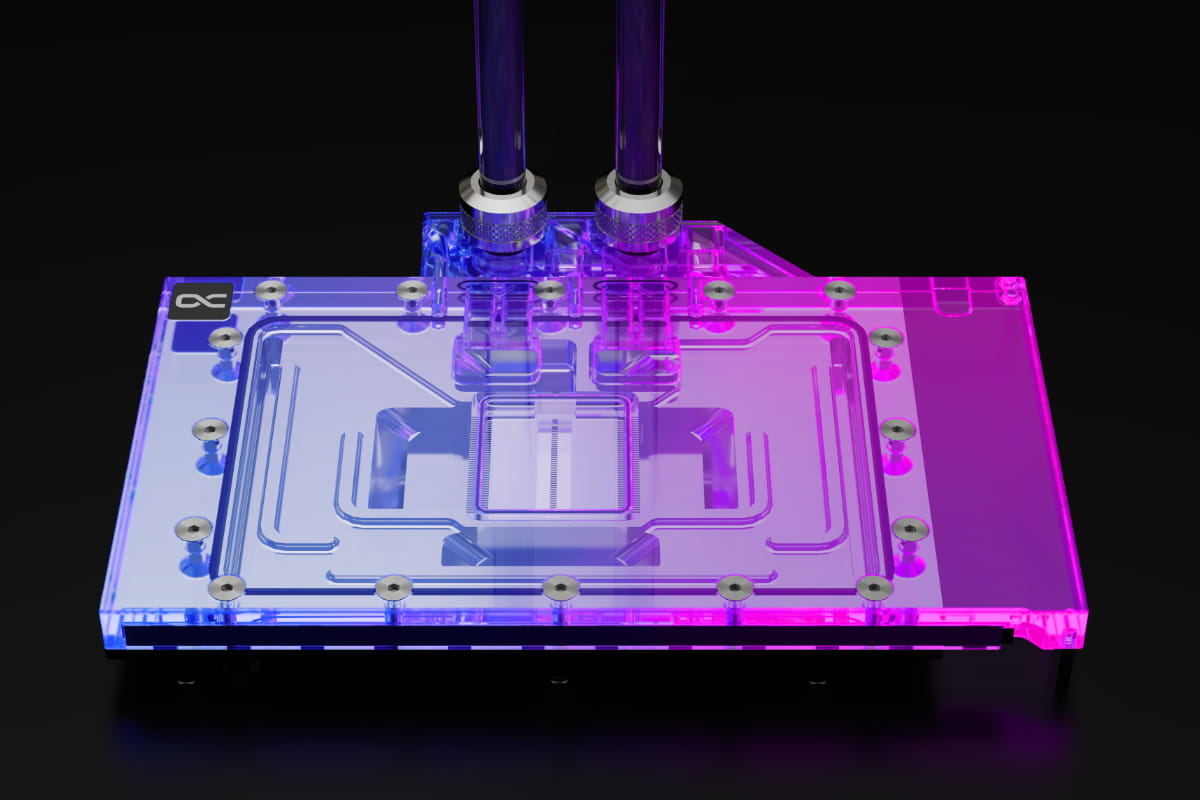 Die nächste Generation - der Alphacool Eisblock Aurora Wasserkühler für Geforce RTX 40XX Grafikkarten. Um die enorme Abwärme dieser Grafikkartengeneration bestmöglich abzuführen, wurden am Wasserkühler zahlreiche Optimierungen im Vergleich zum Vorgängermodell durchgeführt. Die Finnenstruktur wurde angepasst und ermöglicht einen sehr guten Wasserdurchfluss bei gleichzeitiger Vergrößerung der Kühlfläche. Die modifizierte Düsenplatte mit verbesserter Zufluss-Engine sorgt für eine optimale Verteilung des Wassers auf den Kühlfinnen.