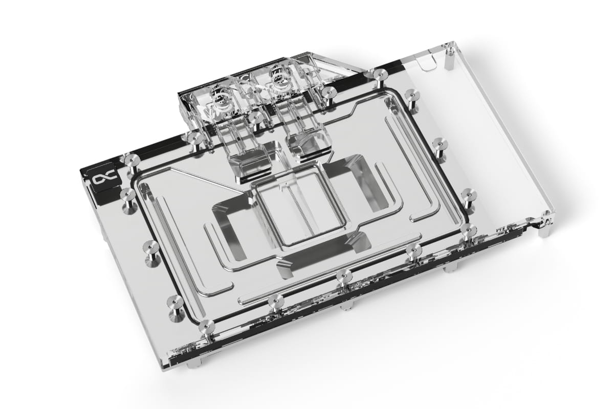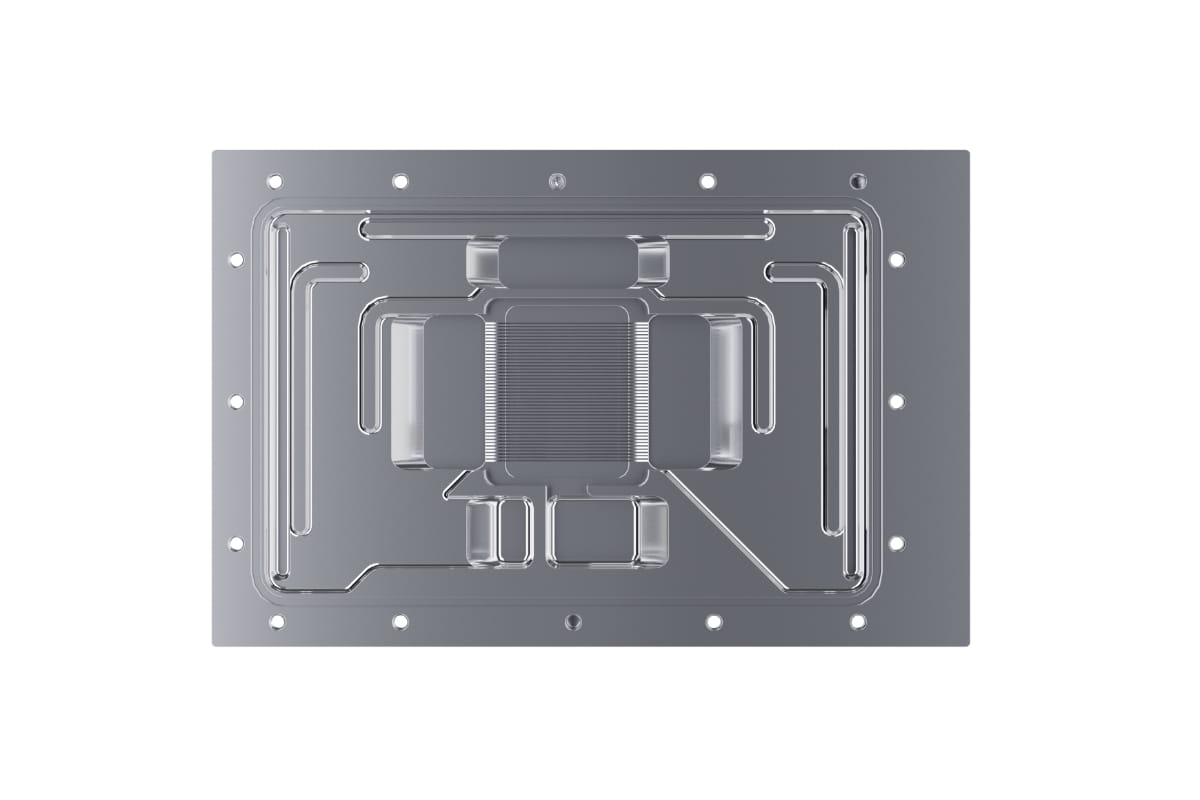 Die Finnenstruktur dieser Eisblock Kühlergeneration wurde gemeinsam mit Nvidia-Boardpartnern entwickelt. Die Finnendicke beträgt 0.4 mm, der Abstand der Kühlfinnen zueinander 0,4 mm. Das gewährleistet einen sehr guten Wasserdurchfluss bei gleichzeitiger Erhöhung der möglichen Kühlfläche. Die Düsenplatte verfügt über ein überarbeitetes Inlay, dass den Wasserdruck besser auf die Finnen verteilt und die Wärmeaufnahme optimiert. Der angepasste Wasserzufluss verhilft dem Wasser zu einem besseren Einströmwinkel.
