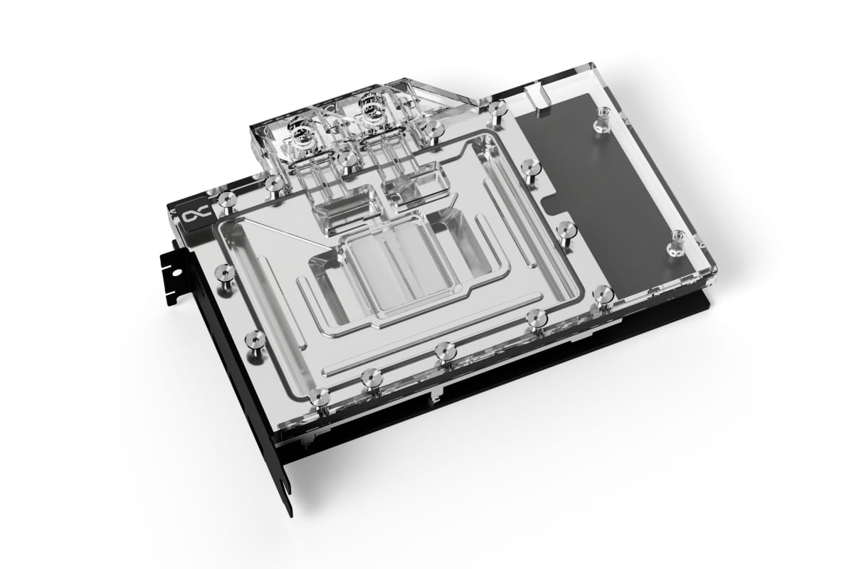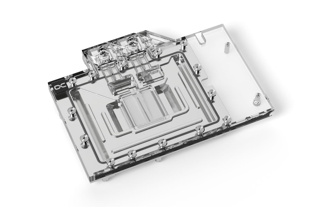 Die Finnenstruktur dieser Eisblock Kühlergeneration wurde gemeinsam mit Nvidia-Boardpartnern entwickelt. Die Finnendicke beträgt 0.4 mm, der Abstand der Kühlfinnen zueinander 0,4 mm. Das gewährleistet einen sehr guten Wasserdurchfluss bei gleichzeitiger Erhöhung der möglichen Kühlfläche. Die Düsenplatte verfügt über ein überarbeitetes Inlay, dass den Wasserdruck besser auf die Finnen verteilt und die Wärmeaufnahme optimiert. Der angepasste Wasserzufluss verhilft dem Wasser zu einem besseren Einströmwinkel.