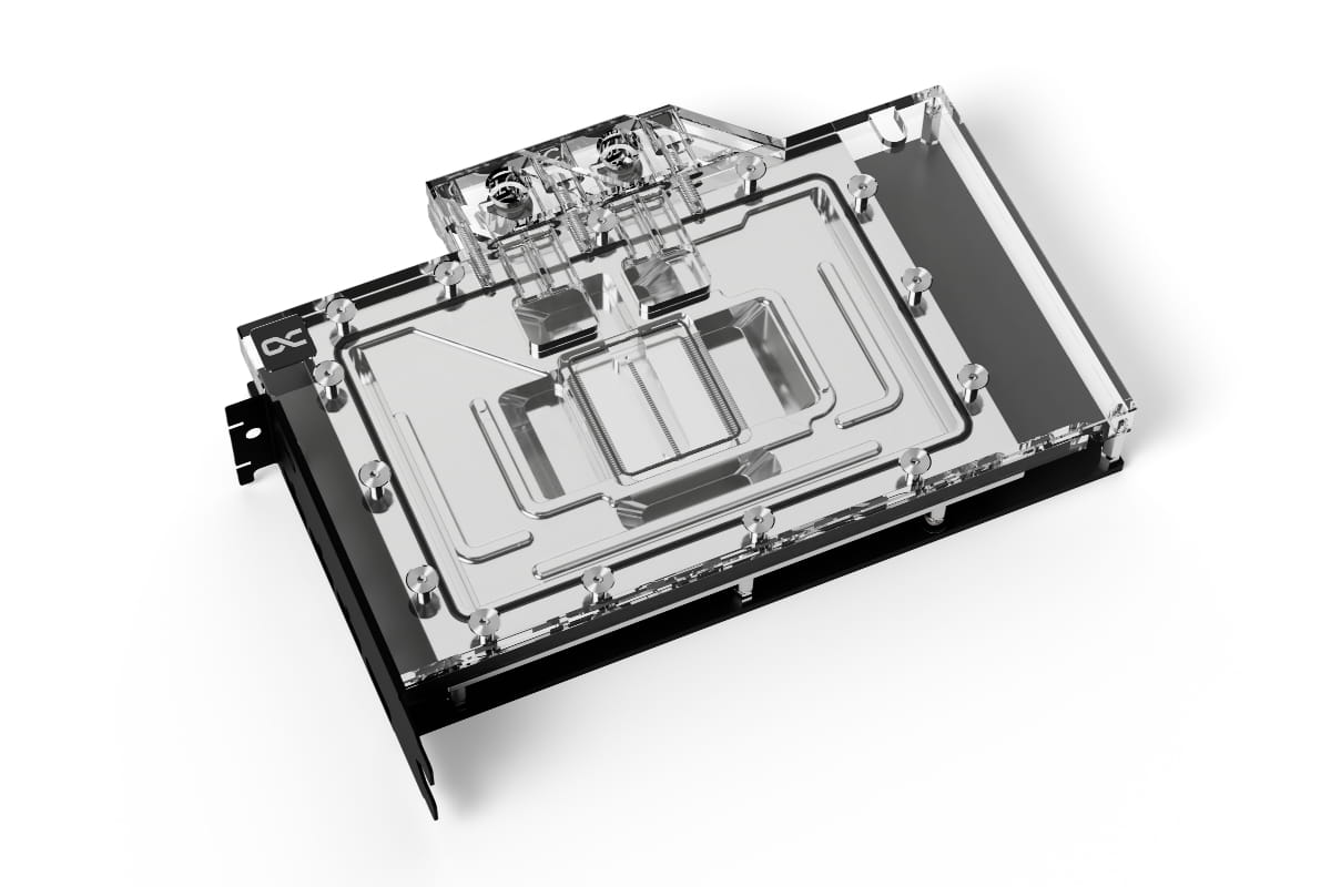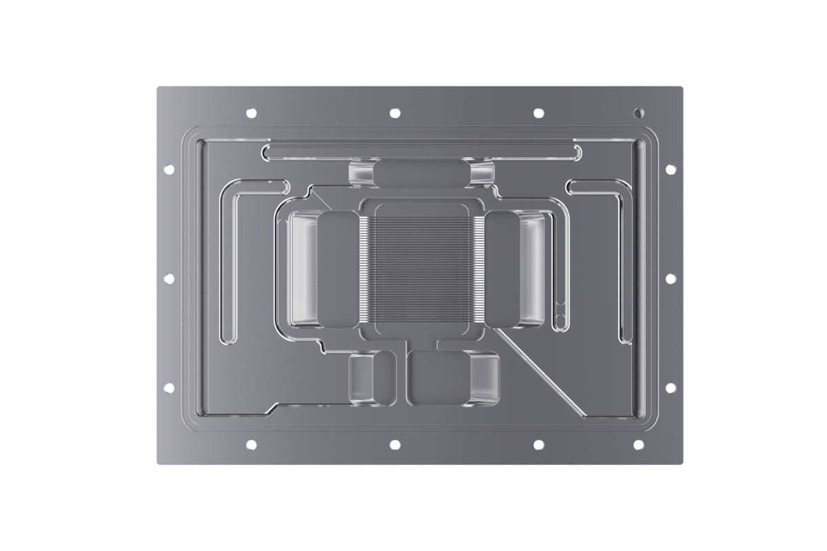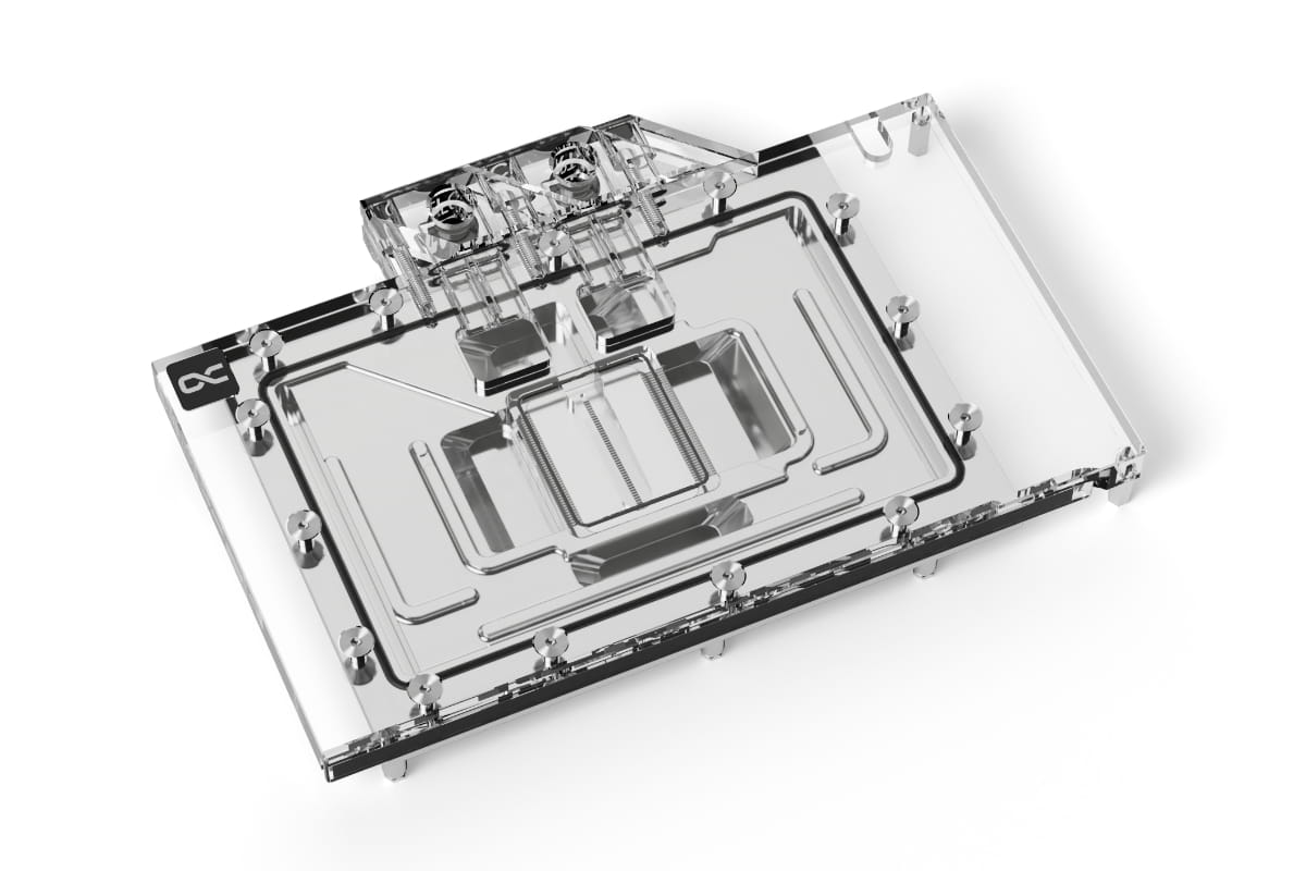 Die Finnenstruktur dieser Eisblock Kühlergeneration wurde gemeinsam mit Nvidia-Boardpartnern entwickelt. Die Finnendicke beträgt 0.4 mm, der Abstand der Kühlfinnen zueinander 0,4 mm. Das gewährleistet einen sehr guten Wasserdurchfluss bei gleichzeitiger Erhöhung der möglichen Kühlfläche. Die Düsenplatte verfügt über ein überarbeitetes Inlay, dass den Wasserdruck besser auf die Finnen verteilt und die Wärmeaufnahme optimiert. Der angepasste Wasserzufluss verhilft dem Wasser zu einem besseren Einströmwinkel.