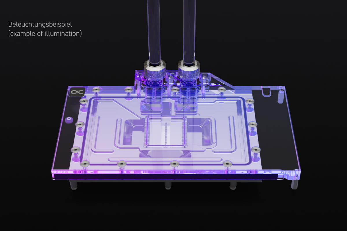Das Aurora Design der Geforce RTX 40XX Eisblock Generation ist optisch ruhiger und schlichter. Nur ein O-Ring umläuft den gesamten Kühler. Die Konstruktion rund um die Kühlfinnen und der Jetplate sorgt für eine klarere Optik. Die Beleuchtung der digital adressierbaren RGB-LEDs wird dank der Verchromung noch besser im Kühler verteilt. Das Terminal entspricht in seiner Formgebung dem klassischen Aurora Design.