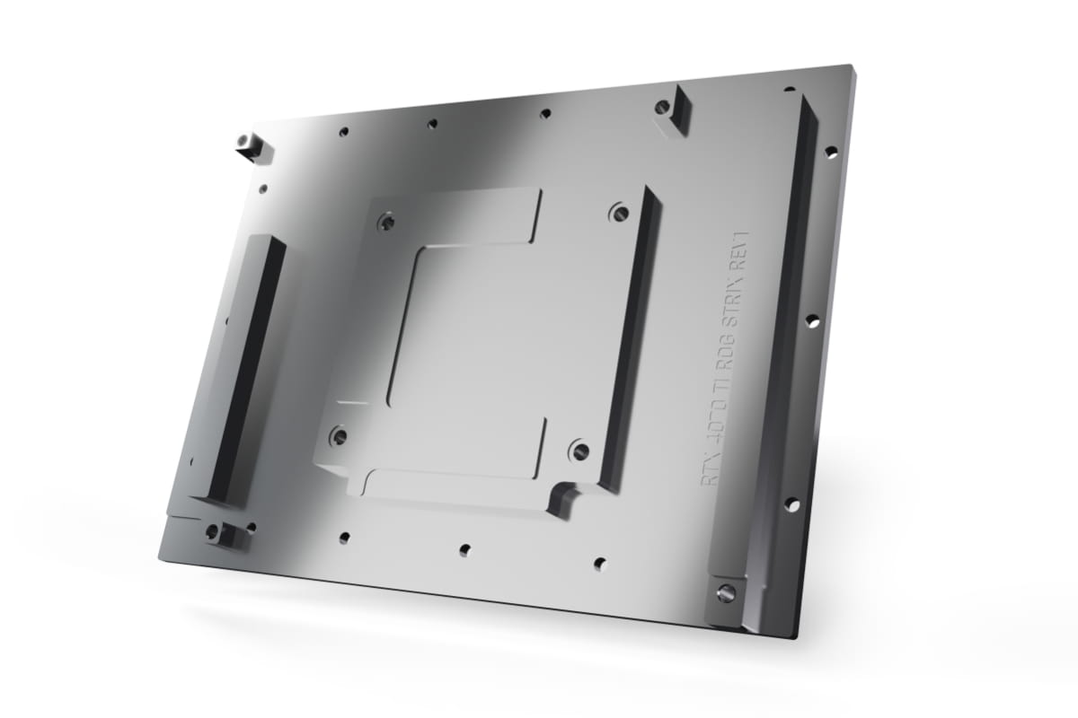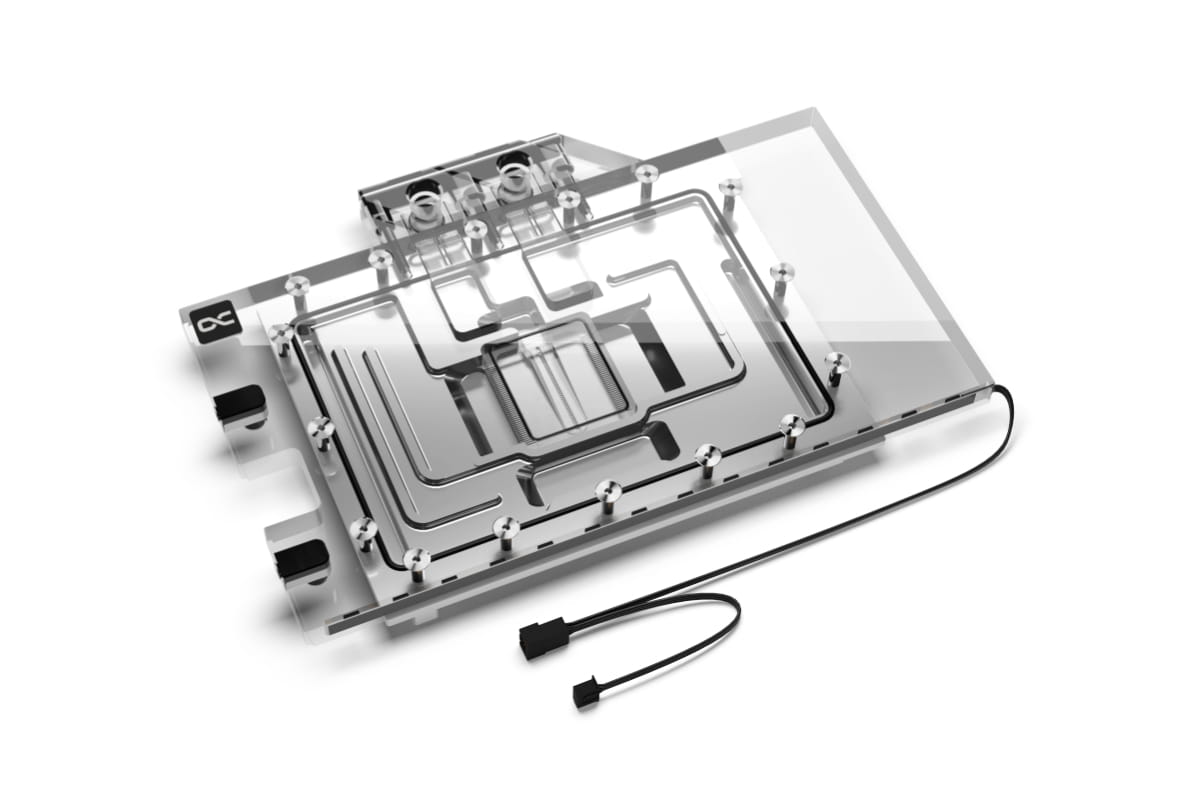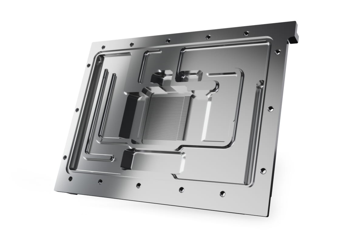 Die Finnenstruktur dieser Eisblock Kühlergeneration wurde gemeinsam mit Nvidia-Boardpartnern entwickelt. Die Finnendicke beträgt 0.4 mm, der Abstand der Kühlfinnen zueinander 0,4 mm. Das gewährleistet einen sehr guten Wasserdurchfluss bei gleichzeitiger Erhöhung der möglichen Kühlfläche. Die Düsenplatte verfügt über ein überarbeitetes Inlay, dass den Wasserdruck besser auf die Finnen verteilt und die Wärmeaufnahme optimiert. Der angepasste Wasserzufluss verhilft dem Wasser zu einem besseren Einströmwinkel.