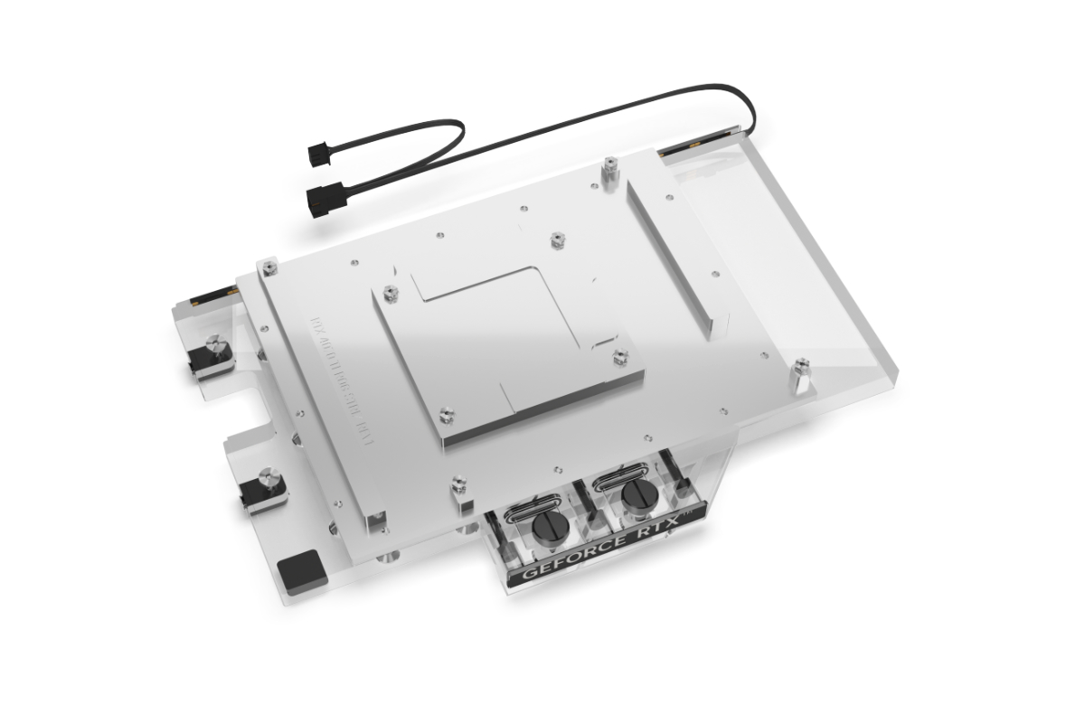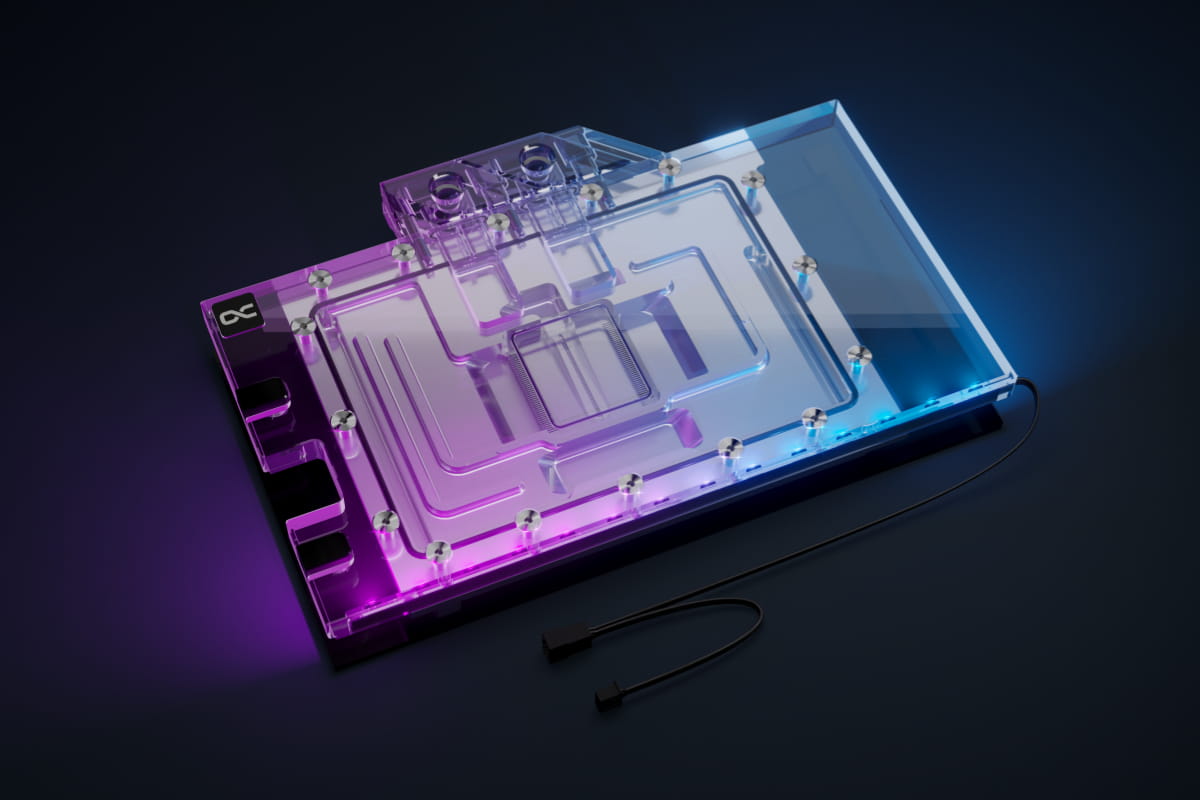 Das Aurora Design der Geforce RTX 40XX Eisblock Generation ist optisch ruhiger und schlichter. Nur ein O-Ring umläuft den gesamten Kühler. Die Konstruktion rund um die Kühlfinnen und der Jetplate sorgt für eine klarere Optik. Die Beleuchtung der digital adressierbaren RGB-LEDs wird dank der Verchromung noch besser im Kühler verteilt. Das Terminal entspricht in seiner Formgebung dem klassischen Aurora Design.