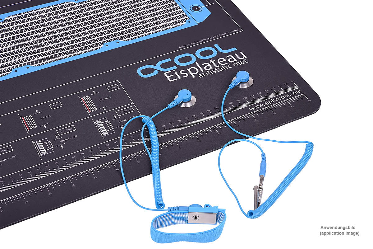 Diese Antistatik Handgelenk Manschette mit einer Krokoklemme und einem Anti-Statik-Armband können an die Alphacool Eisplateau Anti-Statik-Matte angeschlossen werden, um so bei entsprechendem Untergrund die statischen Ladungen direkt abzuleiten.