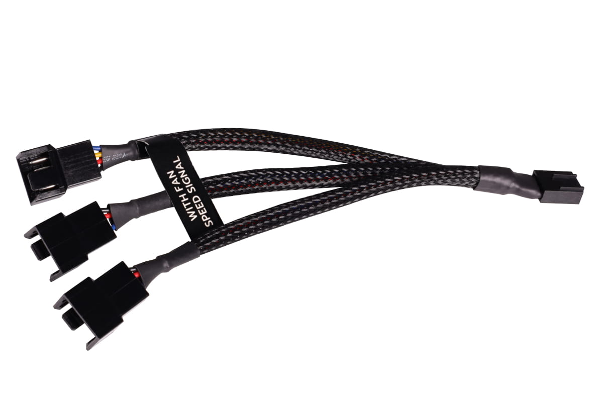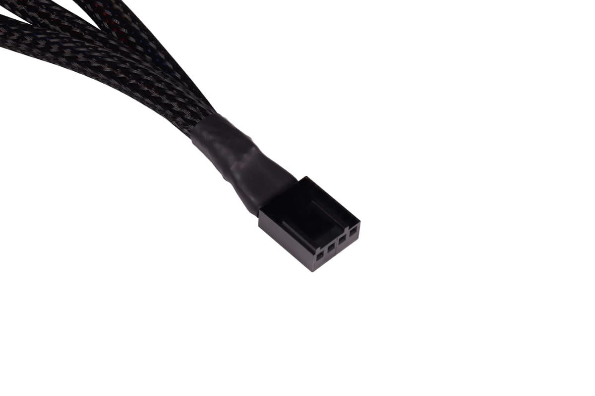 Gesleevtes 4-Pin auf 3x 4-Pin Y-Splitter Verteilerkabel. Verteilt Stromversorgung und PWM Signal auf mehrere Lüfteranschlüsse. Das Sleeving bietet zusätzlichen Schutz, Stabilität und eine längere Lebensdauer.