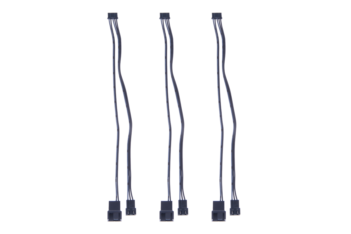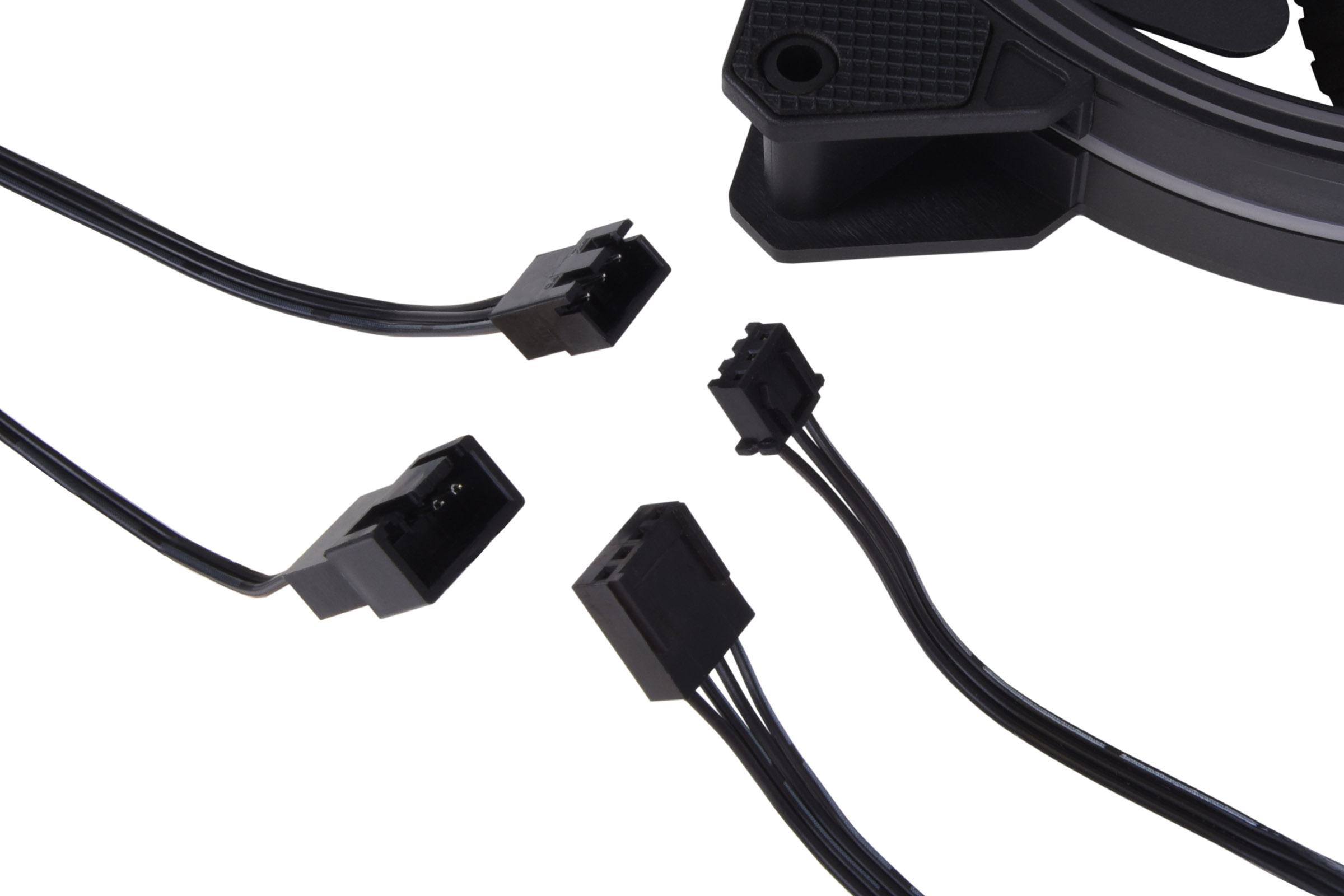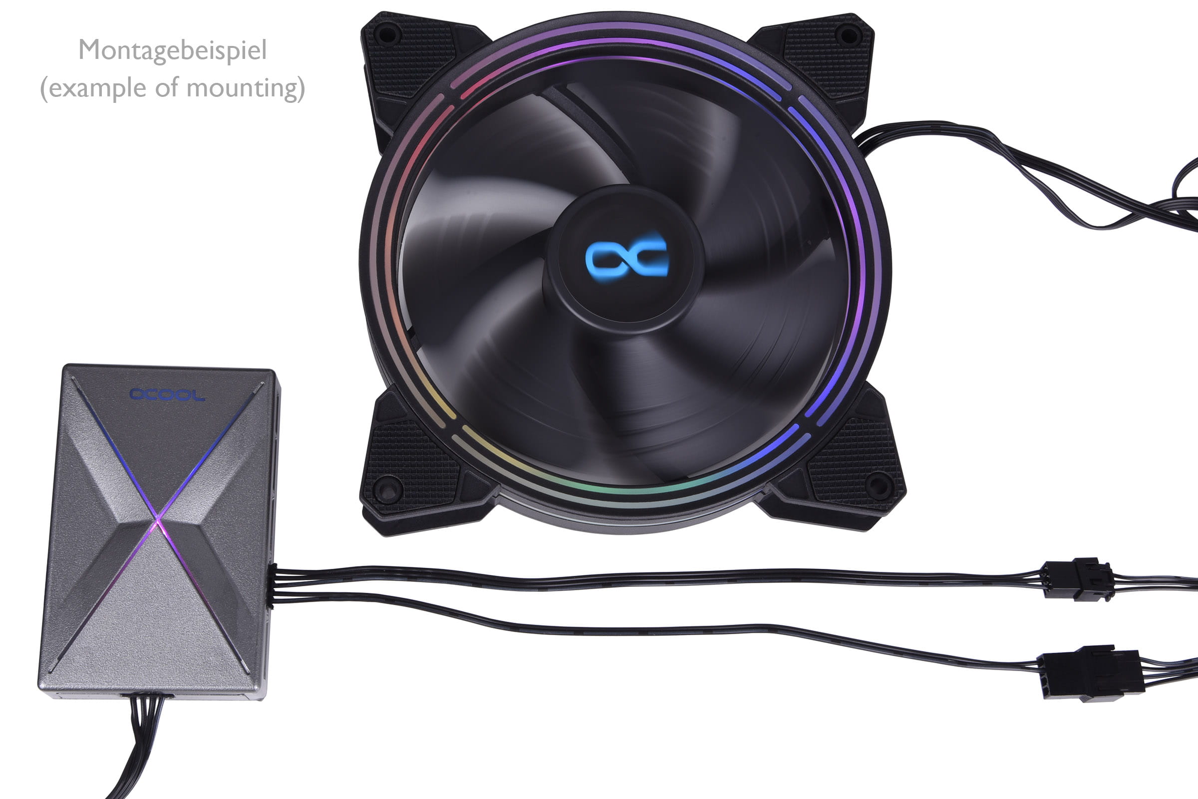 Der Eis-Matrix II Adapter bietet die Möglichkeit weitere Alphacool Lüfter direkt an den Eis-Matrix II Controller anzuschließen. Der Eis-Matrix II Adapter besitzt auf einer Seite einen 5-Pin Anschluss der direkt mit dem Controller verbunden wird. Auf der anderen Seite des 20 cm langen Kabels findet sich ein 4-Pin PWM Anschluss für die Kontrolle des Lüfters und ein 3-Pin JST Stecker für die Steuerung der adressierbaren Digitalen RGB LEDs des Lüfters.