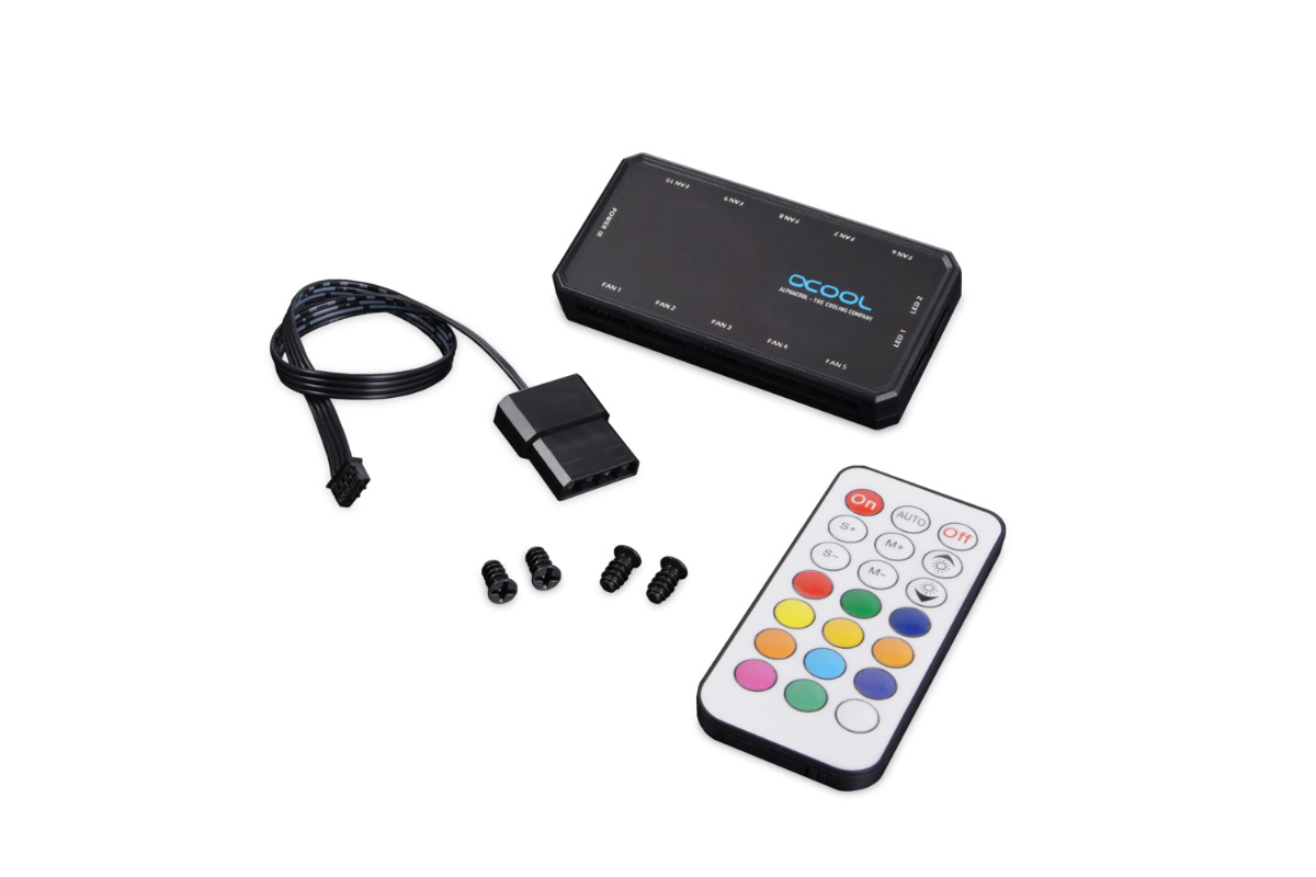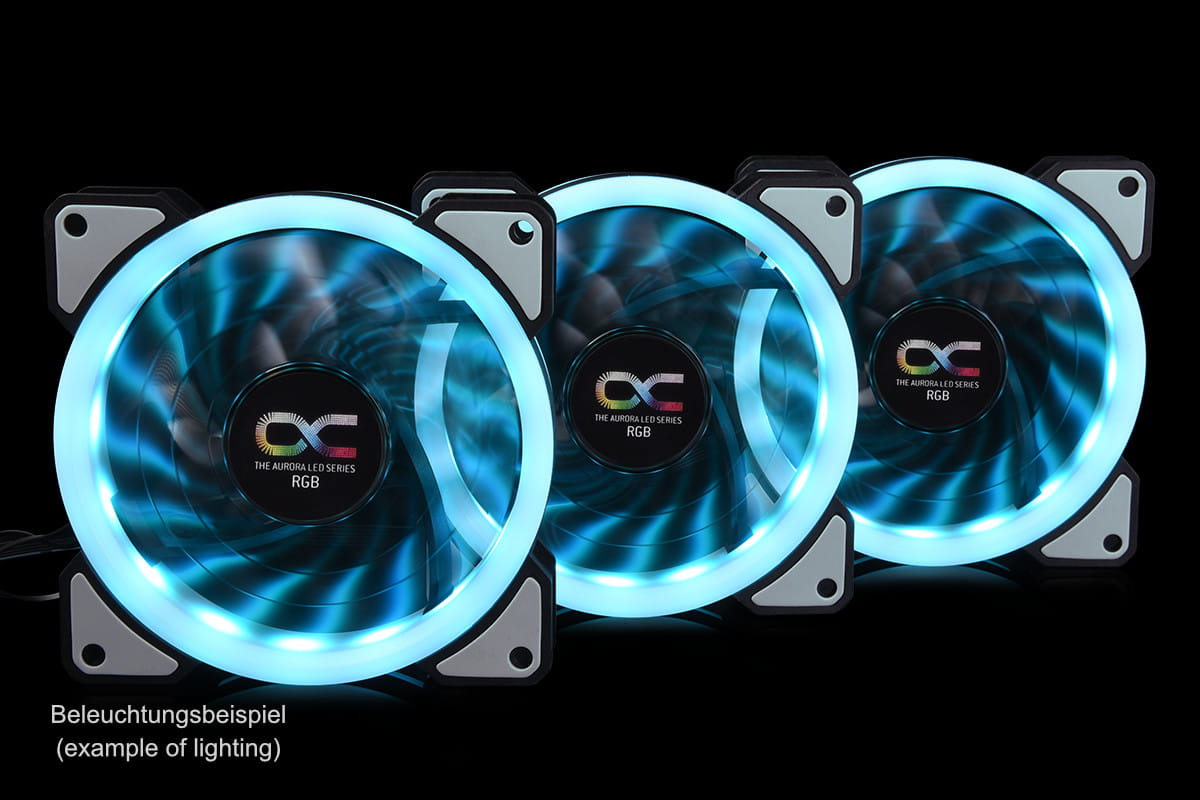 Der Alphacool Eiszyklon Aurora LUX Lüfter besticht durch seine aRGB-LEDs und diffusen Lichtelemente, wodurch das Licht gleichmäßig verteilt wird. Besonders auf Radiatoren spielt er seine Stärken aus, da der Lüfter einen hohen statischen Druck erzeugt, auch wenn er sich langsamer dreht. Seine maximale Drehzahl beläuft sich auf 1100 U/min. Durch seinen natürlich entkoppelten Rahmen, bleibt er auch bei dieser Drehzahl leise und ruhig. Anders als bei vielen anderen Lüftern, verfügt er über nur ein Kabel, welches auf einem 6-Pin Stecker endet. Über den Controller Aurora LUX Digital RGB von Alphacool, lässt sich über dieses eine Kabel, sowohl die Drehzahl regulieren, als auch die Beleuchtungseffekte und Farben einstellen.
