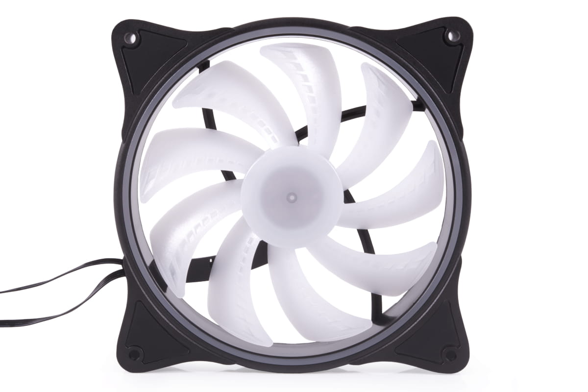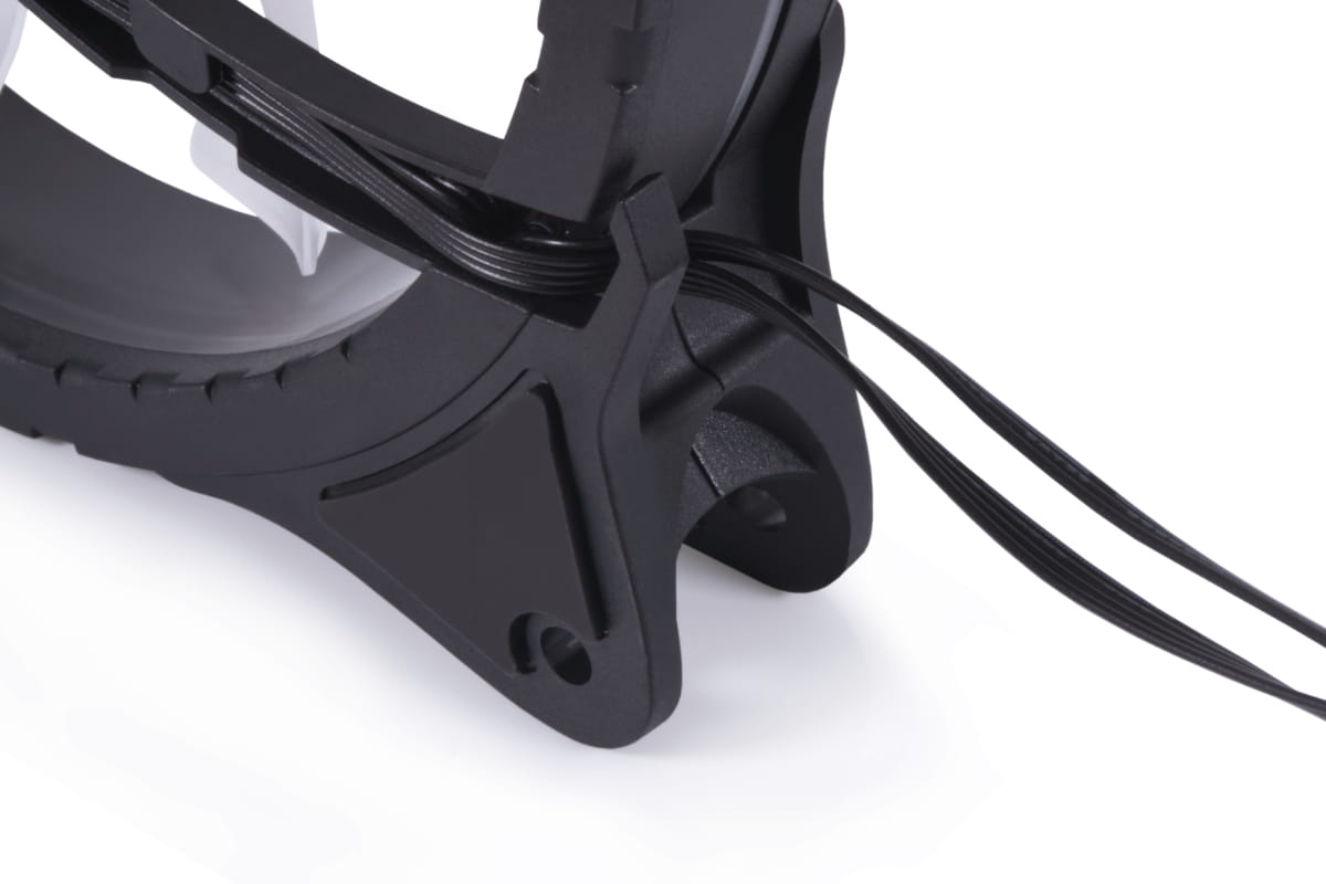 In Rahmen und Nabe sind 24 digital adressierbare 5V RGB LEDs verbaut die den gesamten Lüfter ausleuchten. Dadurch wird eine einzigartige Beleuchtung erzeugt die sehr edel wirkt. Dank der eingelassenen Diffusoren verteilt sich das Licht gleichmäßig. Eine punktuelle Ausleuchtung wird dadurch vermieden. Einzelne LEDs sind nicht mehr erkennbar.