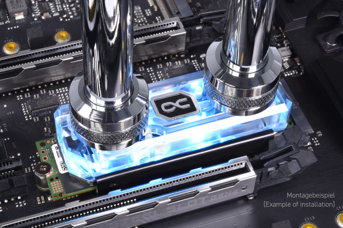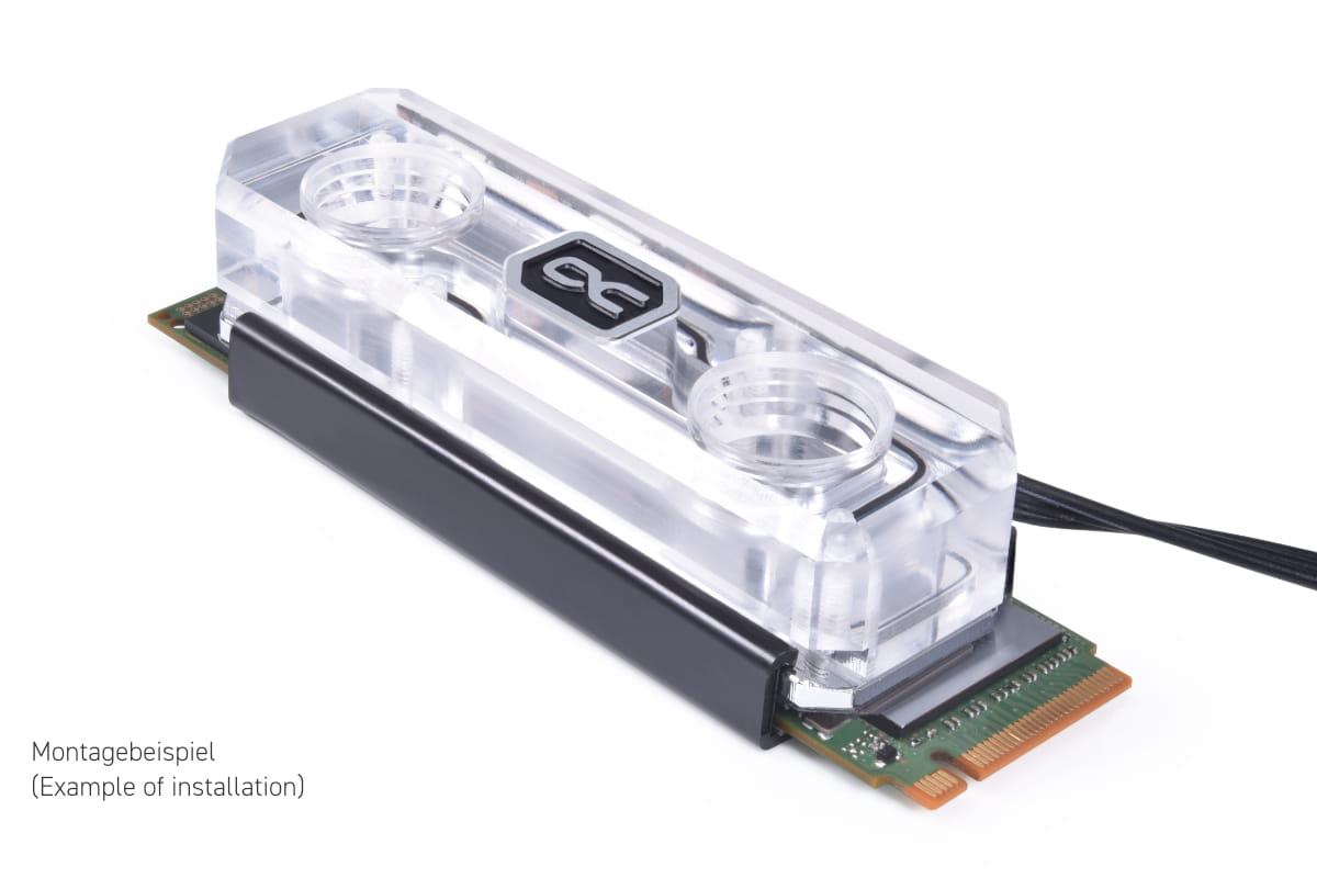 Der HDX Apex Acryl aRGB Kühler ist kompatibel zu M.2 2280 SSDs, die ein- bzw. beidseitig bestückt sind. Bei einer beidseitigen Bestückung des PCBs mit Speicherchips wird auf beiden Seiten das 0,5mm Wärmeleitpad verwendet. Sind nur auf einer Seite Speicherchips verbaut, dann verwendet man auf der Seite ohne Chips das 1,5mm Wärmeleitpad. Nachdem Ober- und Unterseite des SSD entsprechend mit Wärmeleitpads bestückt sind, wird der SSD Speicher in den Halteclip geschoben und unter dem Kühler montiert. Der Einbau auf das Mainboard erfolgt dann wie gewohnt. Der Kühler kann nun mithilfe der vorhandenen G1/4" Anschlüsse in den Wasserkreislauf eingebunden werden.