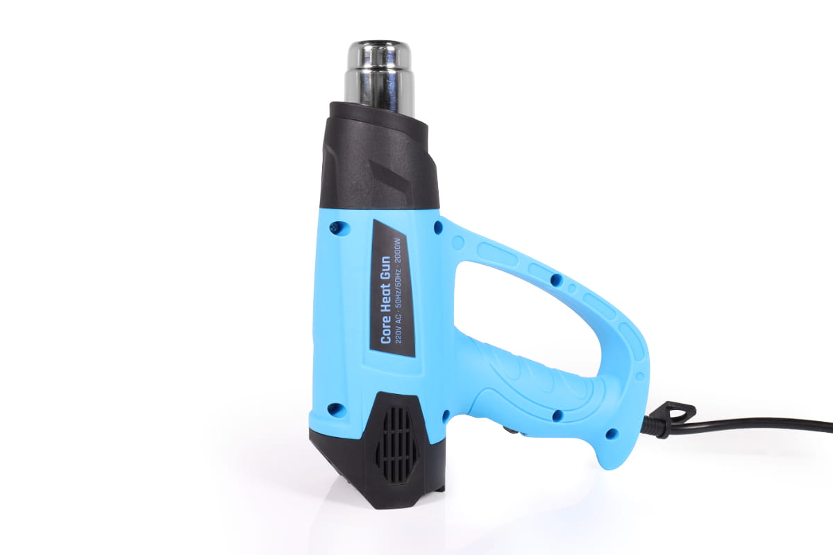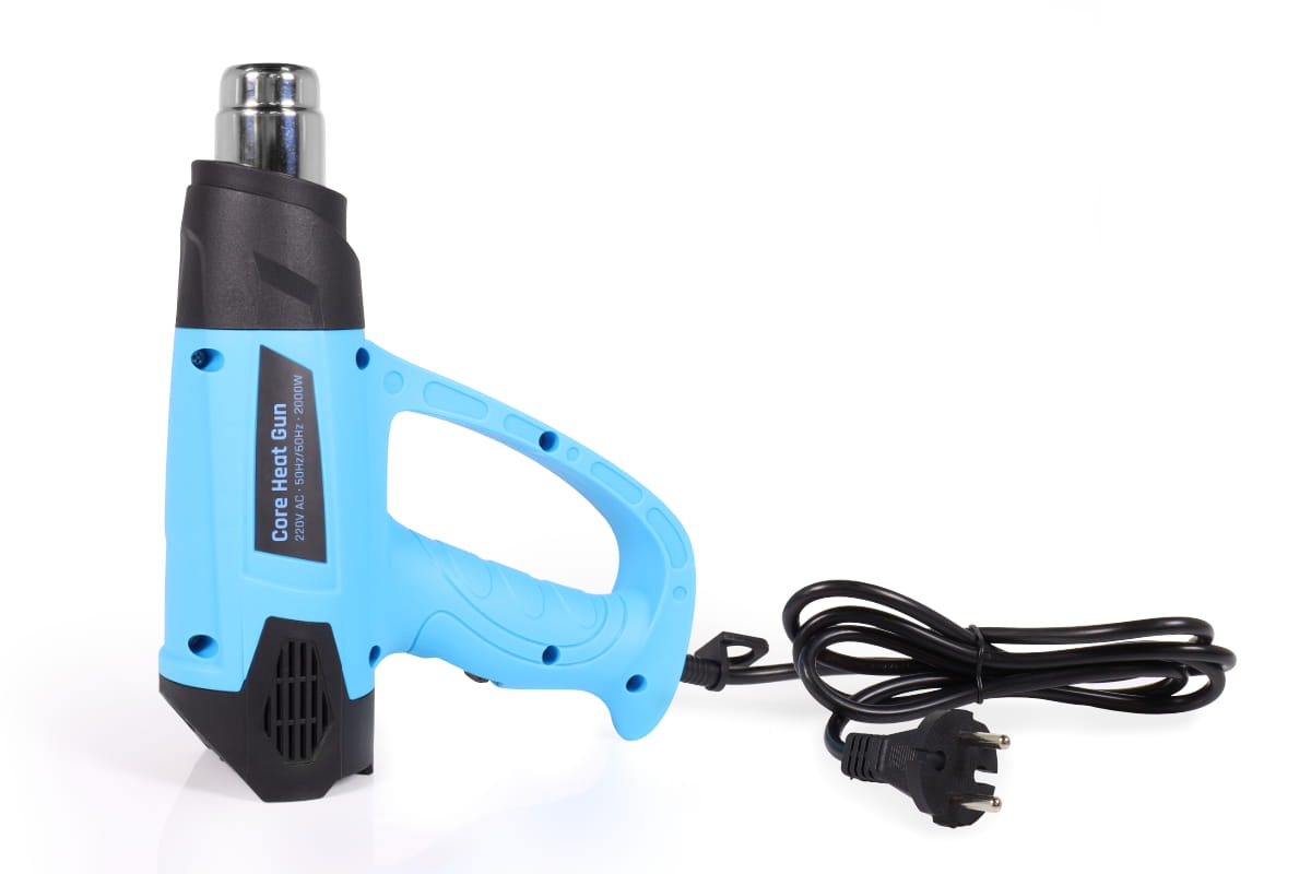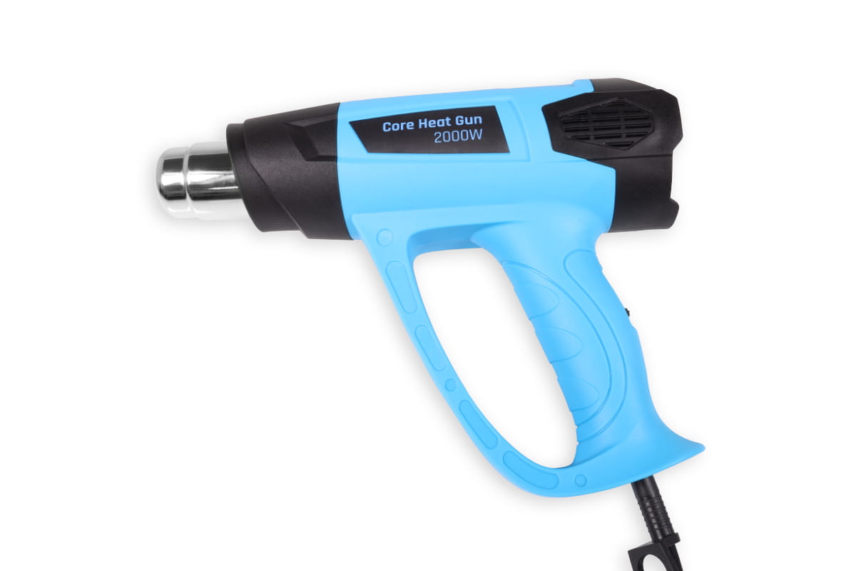 Durch einen Schalter am Griff lässt sich die Luftgeschwindigkeit der Core Heat Gun in zwei Stufen regulieren, während ein Drehregler die Anpassung der Temperatur ermöglicht. Das Gerät ist für die Verwendung in der Hand oder im abgestellten Zustand ausgelegt. Drei verschiedene Düsenaufsätze für unterschiedliche Anwendungsbereiche sind im Lieferumfang enthalten.
