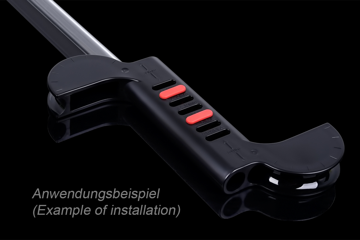 Sowohl HardTubes mit einer Dicke von 12 - 14mm als auch 16mm sind kein Problem. Bis zu 180° Kurven lassen sich kinderleicht und schön sauber biegen. Mit Hilfe der roten Gummi Längenbegrenzer kann der gerade Teil des Rohres in Zentimeter Abständen eingestellt werden.