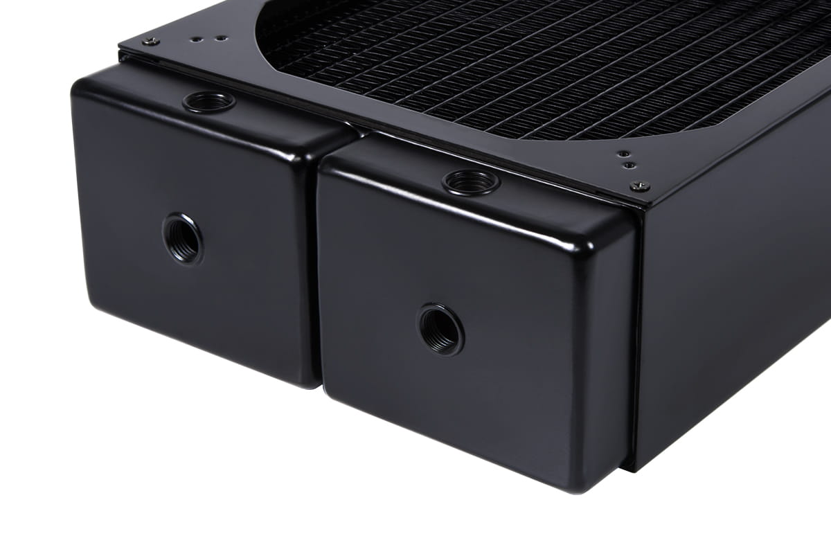 Der Alphacool NexXxoS Monsta 200 mm Radiator bietet sechs G1/4“ Gewinde für IN und OUT. Ein weiteres G1/4“ Gewinde an der Rückseite des Radiators dient als Fillport. Alternativ kann hier auch ein Temperatursensor oder ein Ablasshahn angebracht werden.