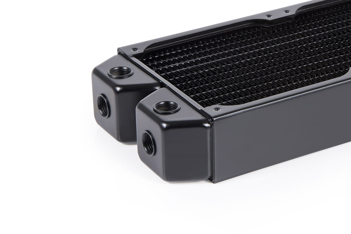 Der Radiator bietet an jedem Ein- und Ausgang jeweils 3 Anschlussmöglichkeiten. Jeweils an der Front-, Rück- und Kopfseite. Insgesamt besitzt der Radiator demnach 12x G1/4“ Anschlüsse. Dadurch lassen sich vielseitige Montagewünsche erfüllen. Dem Radiator liegen sämtliche Schrauben zur Montage im Gehäuse bzw. Serverrack und für die Montage der Lüfter bei. Zusätzliche Schrauben werden in der Regel nicht benötigt. Zwischen den Montagelöchern und den Kühlfinnen ist zudem ein Schutzblech untergebracht. Dadurch soll verhindert werden, dass zu langen Schrauben die Kühlfinnen und Kühlkanäle beschädigen können.