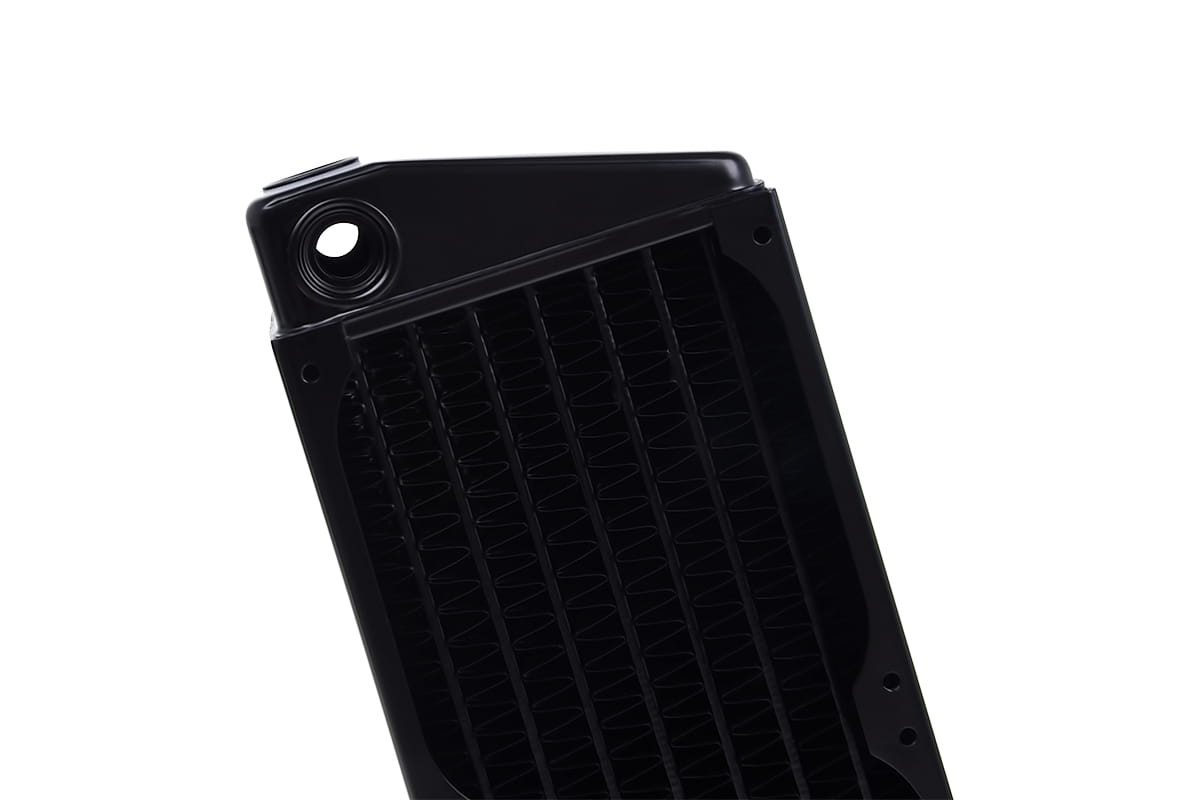 Damit es zu keinen bösen Überraschungen bei der Bemaßung kommt, hat Alphacool spezielle patentierte Verschlussschrauben entwickelt die bündig mit dem Radiator abschließen. Bisherige Lösungen standen immer über die Länge oder Breite des Radiators über, denn sie waren nicht versenkt.