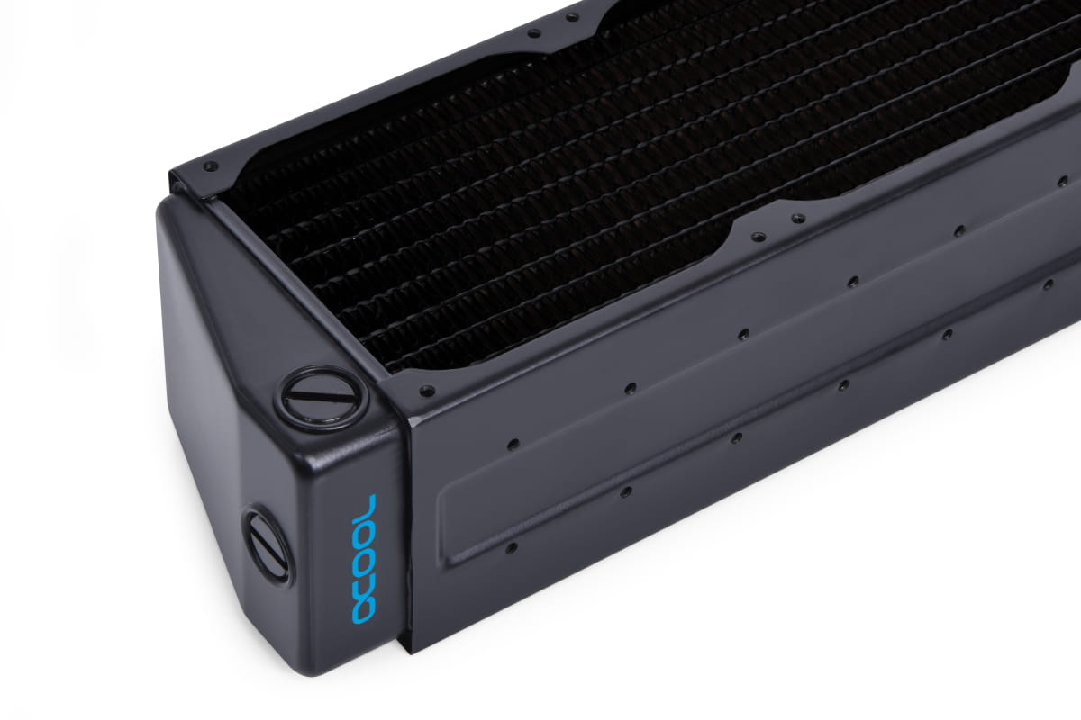Um die Performance des Radiators zu maximieren, greift Alphacool tief in die Trickkiste und verwendet für Kühlfinnen, Kühlkanäle und Vorkammern reines Kupfer aufgrund der hohen Wärmeleitfähigkeit von 400 W/mK (im Vergleich: Aluminium 236 W/mK). Die hohe Finnendichte des Radiators mit einem Finnenabstand von 15 FPI ermöglicht einen optimalen Durchfluss des Luftstroms. Alle Kühlfinnen sind zusätzlich mit kleinen Flaps versehen. Hierbei handelt es sich um winzige Flügel, die den Luftstrom in die gewünschte Richtung leiten und für kontrollierte Luftverwirbelungen sorgen. Das steigert die Kühlleistung und minimiert mögliche Strömungsgeräusche.