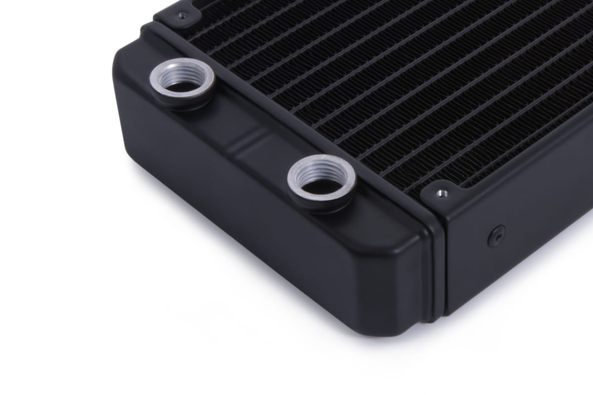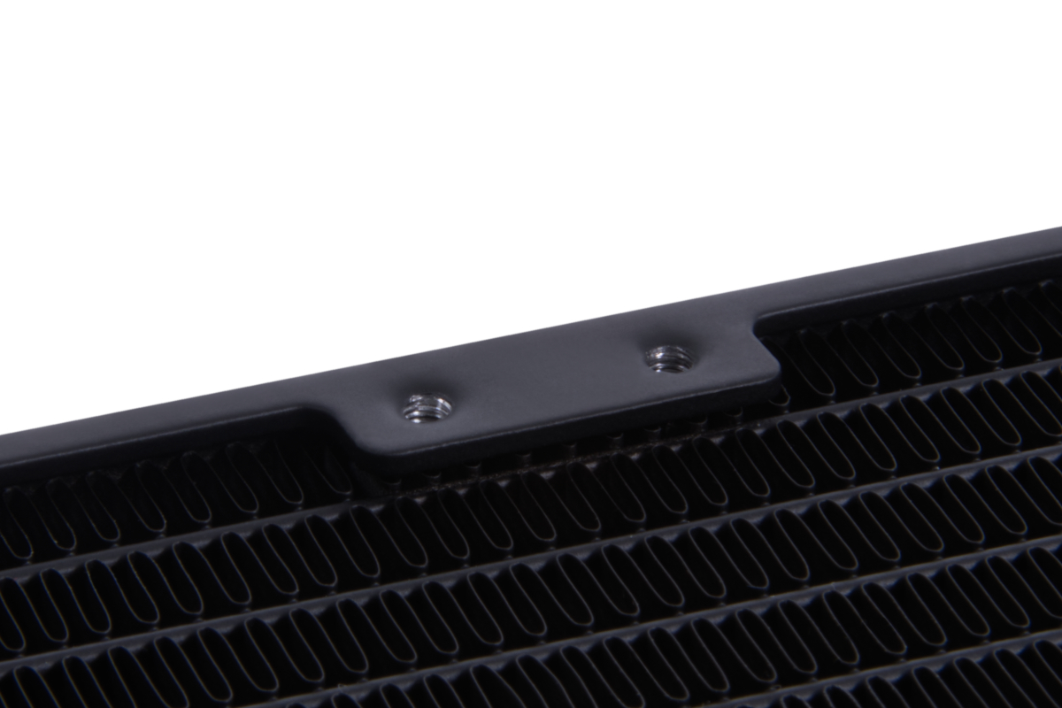 Der Radiator bietet einen Ein- sowie Ausgang (IN/OUT) mit G1/4“ Gewinde. Dem Radiator liegen Schrauben für die Gehäusebefestigung (M3x5) und für die Lüftermontage (M3x30) bei. Zusätzliche Schrauben werden bei einseitiger Lüfterbestückung nicht benötigt.