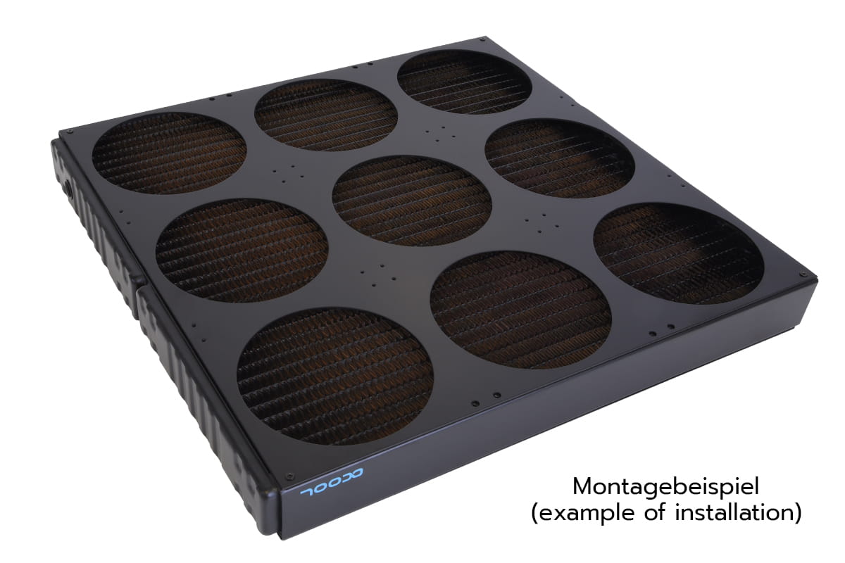 Bei diesem Produkt handelt es sich um eine Blende zur Montage von 9 Lüftern im 140mm Format auf dem Alphacool NexXxoS XT45 Full Copper 1260mm SuperNova Radiator.