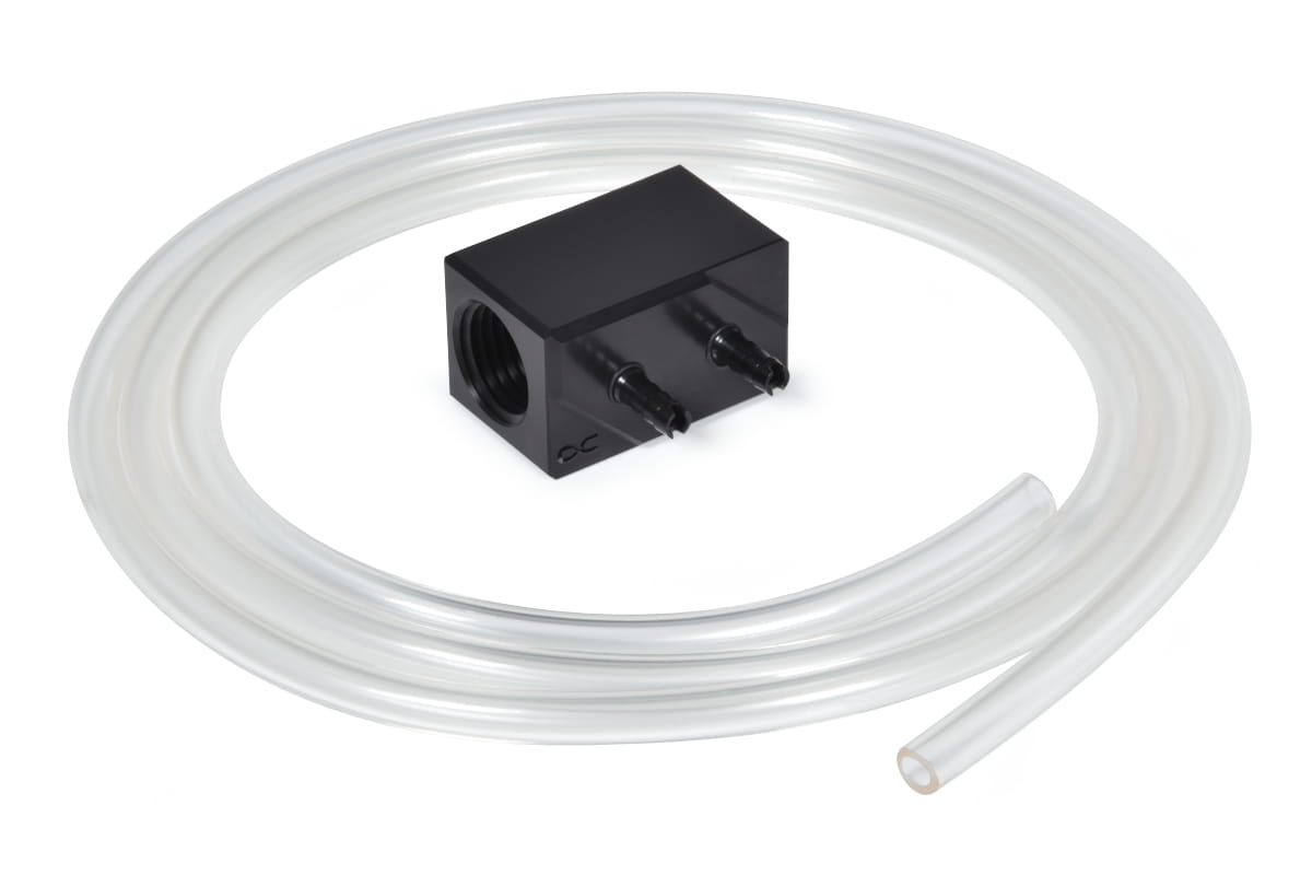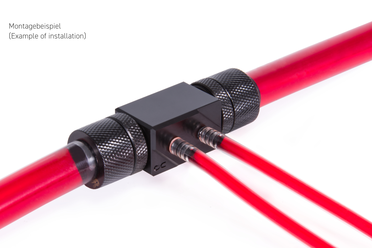 Er eröffnet die Möglichkeit, Alphacool's aktive Backplates oder MCX Wasserkühler einfach in den Wasserkreislauf einzubinden. Dadurch können z. B. RAM-Bausteine und Spannungswandler auf Grafikkarten effizienter gekühlt werden. Die Einbindung des MCX 2x Verteilers in den Wasserkreislauf erfolgt unkompliziert über 2 G1/4" Anschlüsse mit Innengewinde. Hier empfehlen sich Alphacool's Anschlüsse aus der Eiszapfen-Serie. Im Lieferumfang ist ein transparenter 5/3mm Schlauch aus PVC enthalten. Der Schlauch bietet mit 1m Länge ausreichend Spielraum für einen flexiblen Einbau des Verteilers.