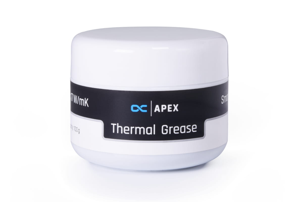 Alphacool's Apex Thermal Grease verfügt über eine extrem hohe thermische Wärmeleitfähigkeit und gehört damit zu den leistungsstärksten Wärmeleitpasten auf dem Markt. Eine bessere Wärmeleitfähigkeit bieten nur noch Wärmeleitpasten aus Flüssigmetall. Ausgeliefert wird das Apex Thermal Grease in einem 100g Behälter mit schraubbarem Verschluss. Die Menge an Wärmeleitpaste reicht für mehrere Anwendungen und kann im Behälter vor Austrocknung geschützt gelagert werden. Außerdem ist das Apex Thermal Grease nicht elektrisch leitend und nicht ätzend. Sollte beim Auftragen eine kleine Menge Paste daneben gehen, sind Schäden an der Hardware höchst unwahrscheinlich.