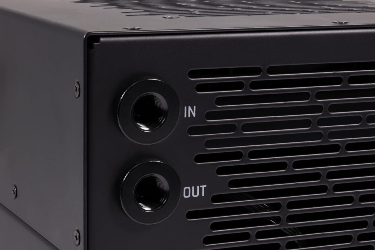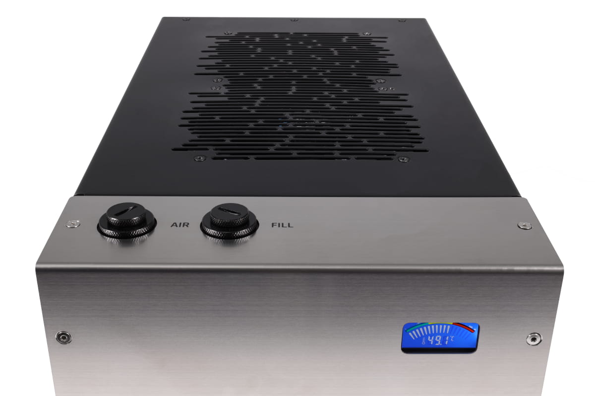 Zum Einsatz kommen jeweils ein 120mm und ein 240mm NexXxoS Full Copper Radiator mit 30mm Dicke in der HPE Variante. Die HPE Variante der NexXxos Radiatoren zeichnet sich durch einen verdichteten Aufbau der Kühlkanäle aus, wodurch mehr Kühlflüssigkeit durch den Radiator fließt und die Kühlleistung deutlich verbessert wird. Die insgesamt drei hauseigenen Core 120mm Lüfter mit hoher Lebenserwartung sorgen für eine optimale Belüftung der Radiatoren. Gesteuert und überwacht werden die Lüfter und die Pumpe von dem ES Guardian Powerfan Hub, welcher bei einem Ausfall der Komponenten Alarm schlägt. Die Temperatur lässt sich mit dem Farbdisplay auf der Vorderseite kontrollieren. Ebenso auf der Vorderseite befindet sich die Füllstandsanzeige. Mit ihr kann bestimmen werden, wieviel Flüssigkeit sich im System befindet.