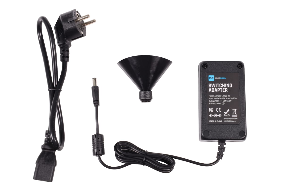 Der ES Orbiter ist schlicht und einfach gehalten. Er lässt sich problemlos mit den zwei eingelassenen Griffen links und rechts anheben. Als Ausgleichsbehälter ist das Alphacool Eisfach mit integrierter und leistungsstarker VPP755 Pumpe der dritten Generation verbaut. Dank der Pumpe lässt sich fast jeder beliebige Kreislauf zuverlässig betreiben. Das Nachfüllen der Kühlflüssigkeit ist dank des Fillports an der Oberseite einfach möglich. Außerdem kann über das daneben liegende Ventil das System ganz einfach entlüftet werden. Der Ein- und Ausgang der Wasseranschlüsse befindet sich wie der Stromanschluss auf der Rückseite des Orbiters.